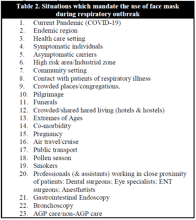 There is little impact on breathing effort and gas exchange as long as the wearer gets adapted to the modified version of the face mask. Prolonged use of a single face mask is not recommended beyond 4 hours due to retention of moisture from exhaled breath. Excessive moisture results in the retention of pathogens, dust, and pollens. It causes rapid damage to mask filter besides aggravating thermal discomfort and suffocation. Ultraviolet germicidal irradiation (UVGI) can be performed for the decontamination of face masks to facilitate their reuse. A high dose of UVGI may weaken the polymers causing an increase in particle penetration [16]. More than 10,000 times reduction in contamination of N95R is reported with autoclave, moist steam, bleach, and benzalkonium [12]. There are several hospital and community situations wherein the use of face masks seems mandatory & even life-saving (Table 2). The face mask is perceived as a symbol of “hygiene” in Asia and a sign of “illness” in the West [17]. Lee et al. maintain that particles measuring 0.04-0.2μm can penetrate the SFM, meaning thereby that SFM cannot filter SARS-CoV-2 [18]. We need to recognize that majority of the past studies about face masks involve non-biological particles, artificial aerosolization, and acts of forced expiration e.g. sneezing and coughing. The protective efficacy of SFM is liable to increase if the velocity factor is eliminated during normal breathing and speaking, although the emission of aerosol will increase with a louder voice. These controversies account for a wide variation (10-84%) in rates of adherence to face masks amongst HCWs [17, 19].