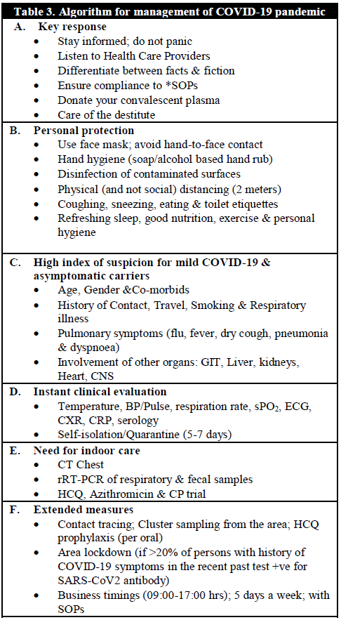 COVID-19 is still on the rise in every continent. With gradual adaptation to the pandemic scenario, more and more people avoid now reporting to the public health authorities. The cost of evaluation with multiple rRT-PCRs is high. There is a fear of follow-up by local police after registration as COVID-19 patient. Compliance to compulsory isolation and stay home orders are a challenging tasks especially for the daily wagers. Lockdowns and travel restrictions have seriously impacted our economy. The education is brought to a near halt. Psychological issues and stigma of the disease are adversely impacting our social fabric to an extent that “social distancing” is transforming into “social cut off”. There is growing perception that COVID-19 is “just another flu” which is “man-made conspiracy for economic gains and reduction in world population”. In this situation of rumor-mongering, the key response to the pandemic is closely linked with our attitudes and behaviours as responsible citizens of a country (Table 3). Despite high infectivity of COVID-19, the glimmer of hope lies in its mild course and spontaneous resolution in the majority [27]. Using “SIR” (“susceptible, infected, recovered”) model, 26th of May, 2020 was expected to be the peak infection day in Pakistan with anticipated number of COVID-19 patients reaching 59211209, followed by slow decline on 24th June to reach 3698192 cases and cure rate exceeding 90% [30]. However, true burden of disease cannot be calculated from these numbers because rRT-PCR testing in Pakistan is restricted to overtly symptomatic persons only due to reasons of low affordability. With evolution of COVID-19 in the past 9 months, we have learned that both genders and all ages are equally affected [31]. The co-morbids occur in >20% of patients with COVID-19: cerebrovascular disease (>50%); arterial hypertension (14.9%); diabetes mellitus (7.4%); coronary artery disease (4.2%). More than 87% of the elderly with co-morbids develop serious disease and 72.2% require intensive care [32]. Although non-specific features such as fever and radiologic abnormalities are absent in >50% of confirmed COVID-19 patients [31, 33], thermal scanning (i.e. detection of fever >38*C) [1] is surprisingly the most popular screening method adopted at all domestic and international portals of exit/entry. In our opinion, a brief history and combinational use of tachycardia, arterial hypertension, tachypnoea (>30/minute), and hypoxia (sPO2 <93% on pulse oximetry), supported by ECG, chest X-ray and serology can detect active disease more frequently than thermal scanning alone. Chest x-ray demonstrates bilateral pulmonary infiltrates in 14% of COVID-19 patients [32]. Serology identifies past exposure to SARS-CoV-2 and helps trace contacts or convalescent plasma donors [6, 27]. We suggest that all these parameters should be summed up in a COVID-19 Proforma as one of the SOPs for domestic and international travelling (Table 3). Detection of COVID-19 antibodies is a cost-effective albeit underestimated method for screening and diagnosis. We suggest to: isolate the suspect for 7 days; test for IgM at 7-10 days from symptom onset; test for IgG at 12-14 days from symptom onset or after the disappearance of symptoms; screen asymptomatic individuals with IgG testing; & reserve rRT-PCR for patients with equivocal results. Further disposal of infected persons depends on the information contained in (Table 3).