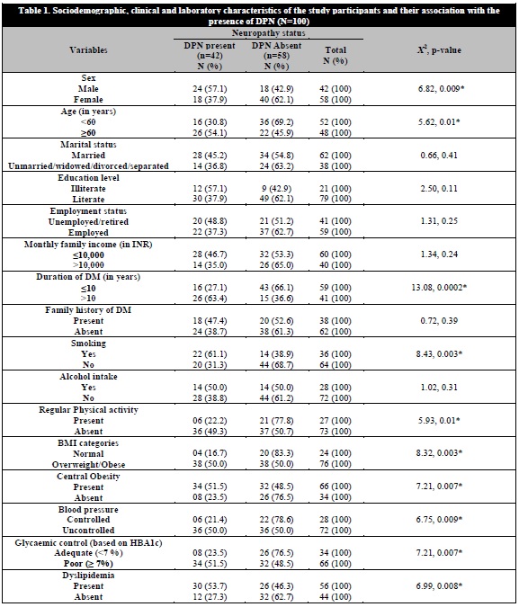 Materials and Methods: A facility-based cross-sectional study was carried out among type 2 diabetic patients attending the Non-Communicable Diseases (NCD) clinic of a secondary care hospital in rural North India. A questionnaire that included sociodemographic details, clinical and laboratory parameters, and the Michigan Neuropathy Screening Instrument (MNSI) for detecting peripheral neuropathy was administered to 100 consecutive eligible patients. Statistical Package for Social Sciences (SPSS) version 25.0 was used for entering and analyzing data. Bivariate analysis was performed to determine the factors significantly associated with the presence of DPN.