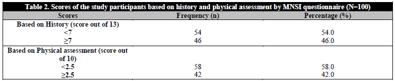 The overall prevalence of DPN among study participants based on the MNSI score was 42.0% (Table 2). Based on the MNSI assessment, 46.0 and 42.0% of study participants had a score of ≥ 7 in the history questionnaire and a score of ≥ 2.5 in the physical examination section of the MNSI, respectively. Of those detected with DPN based on a cut-off score of 2.5 on physical assessment (42 patients), 97.6% had a score of ≥ 7 in the history questionnaire of the MNSI, whereas out of 46 patients scoring ≥ 7 in the history questionnaire, 89.1% had a score of 2.5 or above on physical assessment.