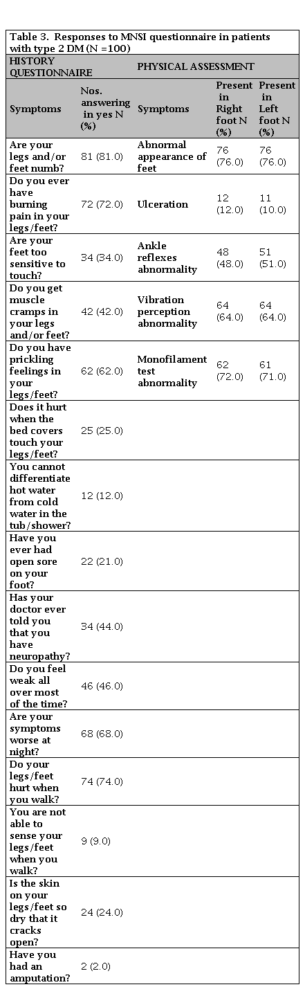 The history questionnaire of the MNSI assessment showed that most of the participants had at least one of the symptoms of DPN. The most frequently reported symptoms in DPN patients were numbness and pain with walking, which was present in 81.0% and 74.0% of study participants, respectively, while the least frequently reported symptoms were and loss of sensation in legs/feet while walking and history of one or more toes amputation, which was present in 16.0% and 2.0% of patients, respectively (Table 3).