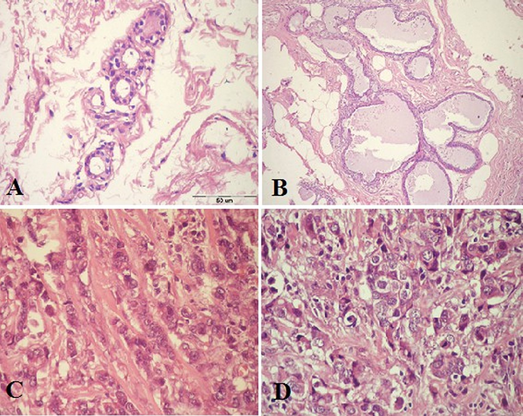A:- Note the acini present in a normal lobule with dark-staining epithelium cells nuclei and homogenous pink cytoplasm and the underlying myoepithelial cells with clear cytoplasm, wild and edema connective tissue a]was seen. B: A fibrocystic case of benign lesion with apocrine cyst formation and mild epithelial hyperplasia in the adjacent duct and intact myoepithelial cell layer. C: IDC grade II case, show tumor cells have abundant eosinophlic cytoplasm and large moderately pleomorphic round to ovoid vesicular nuclei arranged in cords and some contain small nucleoli. There are tumor cells infiltrated by desmoplasticstroma. D: IDC case grade III, show solid nests of tumor cells with large pleomorphic nuclei and some prominent nucleoli. There are numerous mitotic figures, large vesiculated nuclei and many residual nuclei and vacuolated cytoplasm.