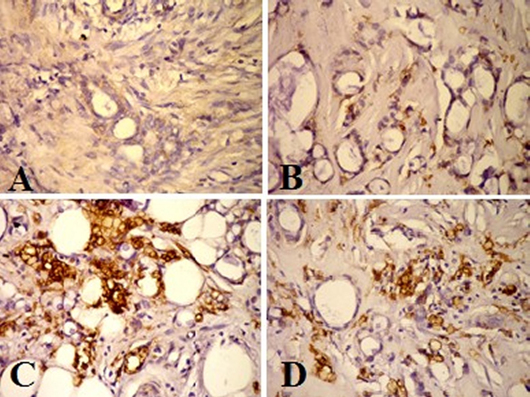 A: Control breast tissue very weak immunoactive at epithelial ductal cells. B: Benign case with mild expression of HER2/neu in the cell membrane of the ductal epithelial cell <10 cells. C: IDC grade II, strong positive immunostaining of HER2/neu (+3) in the epithelial cell membrane > 50. D: Moderate positive expression (+2) of HER2/neu in the ductal epithelia cells membrane >30.