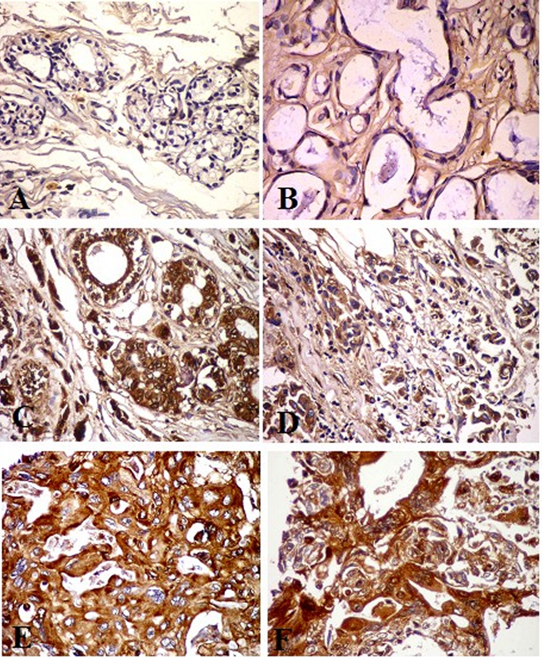 A: Control breast tissue. B: Benign case with negative expression of GP88 in the cytoplasm of the ductal epithelial cell and weak expression in stromal tissue. C and D: Invasive ductal carcinoma (IDC) grade II, strong immunostaining of GP88 (ve3+) in the epithelial cell at the luminal surface. D: Marked positive expression (ve2+) of GP88 in the cytoplasm of the ductal epithelia cells. E and F: IDC grade III, note strong expression (ve3+) of GP88 as the homogenous expression of GP88 in the ductal epithelial cell and surrounding stromal tissue. F: High expression of the GP88 with coarse and homogenate immunostaing at the upper surface of the epithelial ductal cell.