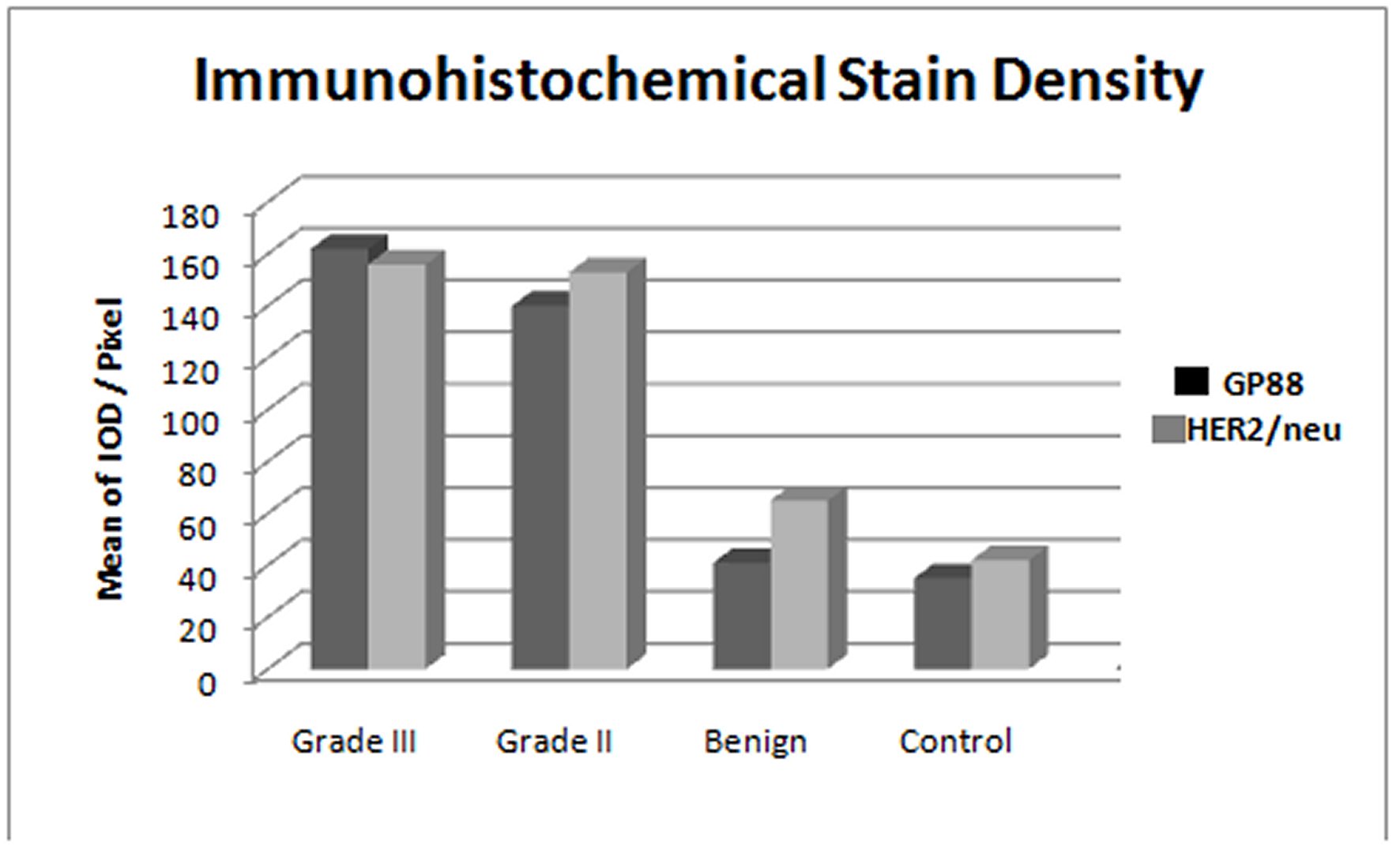 The Integrated Optical Density (IOD) of GP88 and HER2/neu in normal, benign, and IDC groups were analyzed using a digital image analyzer. Images were photographed and recorded using an Olympus microscope equipped with spot digital camera and image J software. The maximum and minimum pixel recorded the integrity of intensity color based on Gray-level acquisition. The analysis of data was carried out by reading ten images for each case. The mean value of each reaction was based on the mean of the pixel number [27]. IOD based on Gray-level transition probabilities in digitized images were graded from dark to light (0 up to 250). The average score across the whole images should be taken; IOD in digitized images were calibrated from strong to weak (180 down to 70) by pixel. This calculation was proceeding after subtracting the pixel value from 250, the pick of lighter elimination.