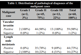 According to the tumor size assessed according to TNM (Tumor, Node, Metastasis) staging system of breast cancer, there was 80% (24/30) of the benign cases was T2 (> 2-5 cm) versus 66% (27/45 grade II and 11/13 grade III) of the malignant cases were T2 (> 2-5 cm) as illustrated in the (Table 2). Whereas the percentage of positive vascular invasion (VI) was 98% (59/60) were distributed in the (Table 1), as well as, Lymph Node Metastasis (LNM) was illustrated in the (Table 1). Also, Noticed the majority of positive cases were represented (44/60.3%) and free of lymph node metastasis cases were 16/60 (27%).