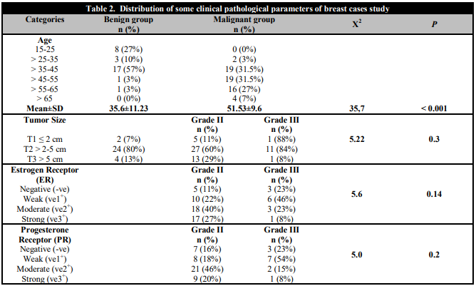 The histopathology diagnosis of the studying cases found the benign cases revealed as the majority (83%, 25/30) of fibroadenoma, while 17% (5/30) cases were represented with fibrocystic disease. At malignant cases, there was a majority of invasive ductal carcinoma (IDC) (98%, 59/60), while 2% (1/50) of the malignant cases were represented with invasive lobular carcinoma (ILC). In addition, according to Scarf'-Bloom-Richardson histological grading system of breast cancer, the majority of the malignant cases diagnosed as grade II (45/60, 75%), grade III cases were represented by 22% (13/60), and the minority cases was grade I (2/60, 3%) of the malignant cases as in the (Table 1).