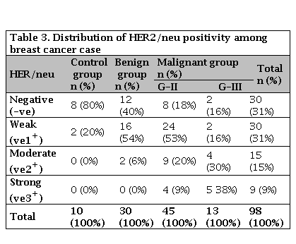 Hormonal status of both estrogen and progesterone receptor (ER&PR) used as a biological marker in the malignant cases were differentiated to malignant grade II & III and illustrated in (Table 2) respectively. According to human epidermal growth factor receptor-2 (HER2/neu) expression, noticed that 53% (24/45) of IDC grade II were weakly positive (-ve), while 38% (5/13) of IDC grade III were strongly positive (ve3+), as shown in (Table 3). As regard to GP88 immunostaining expression resulted a moderate positive expression (ve2+) in 71% (32/45) of grade II IDC and strong (ve3+) in 77% (10/13) of grade III IDC as illustrated in (Table 4).