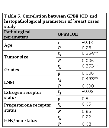 There was no statistical significant correlation between the GP88 IOD and patients' age (r = -0.14, P = 0.28), ER status (r = -0.09, P = 0.50), PR status (r= 0.06, P = 0.65) and HER2/neu status (r = 0.22, P = 0.08) of the studied breast cancer cases, while highly statistical significant correlation was noticed between the GP88 IOD and tumor size (r = 0.354**, P = 0.006), tumor grade (r = 0.353**, P = 0.006) and LNM status (r = 0.493**, P = 0.000) as in Table 5.