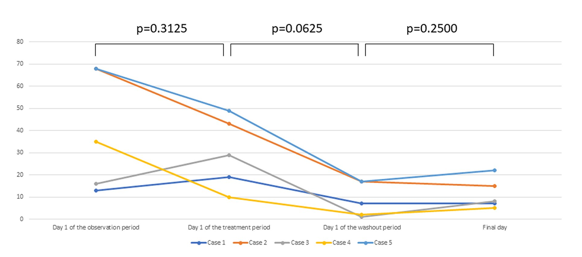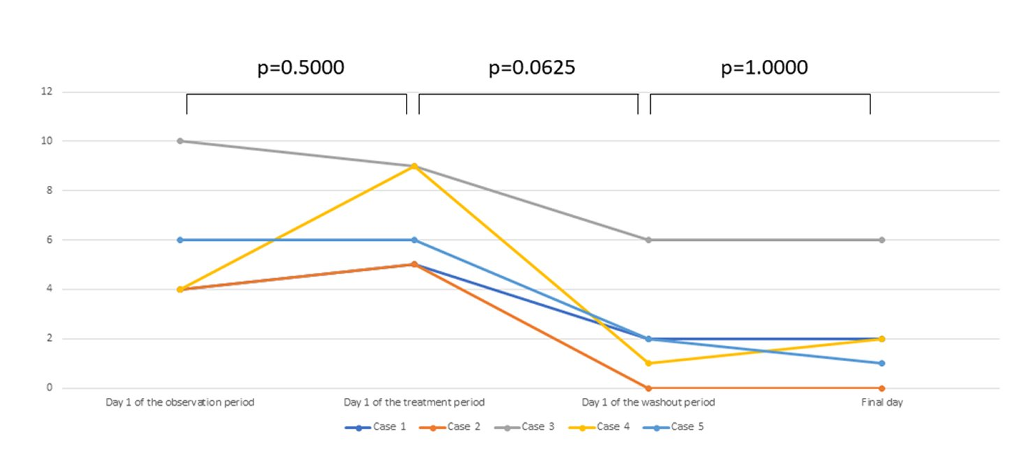 Improvement of clinical findings was observed after treatment (p=0.0625, Wilcoxon signed rank test). There was no exacerbation of findings in the washout period.