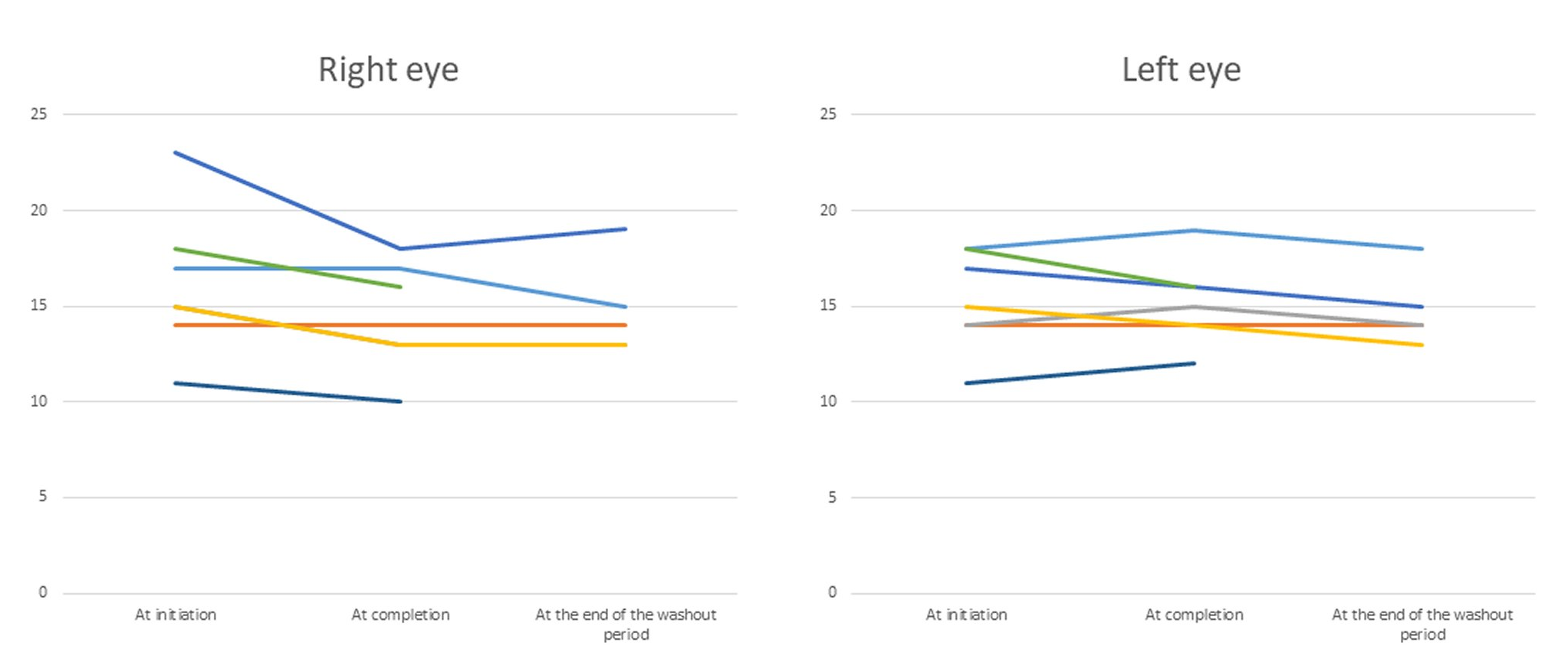 Comparison of VAS scores among the different times of assessment, and comparison of ophthalmological findings or QOL between before and after each study phase was done with the Wilcoxon signed rank test.