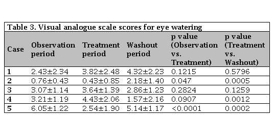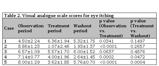 AS scores for itching of the eyes are shown in Table 2. Significant improvement of the VAS score was noted in 3 patients (Cases 2, 4, and 5). While 1 of these patients (Case 5) showed worsening of the VAS score after completion of treatment, the score improved further in another patient (Case 4). VAS scores for watering of the eyes are displayed in Table 3. Significant improvement of the VAS score occurred during treatment in 2 patients (Cases 2 and 5), although both patients showed worsening of the VAS score after completing treatment. On the other hand, the VAS score improved in 1 patient (Case 4) after completion of treatment. Case 1 stated that symptoms were considerably improved, but VAS scores for eye itching and watering did not decrease or actually increased. This patient subsequently reported that she had mistakenly recorded the symptoms she assumed would have occurred without topical therapy.
