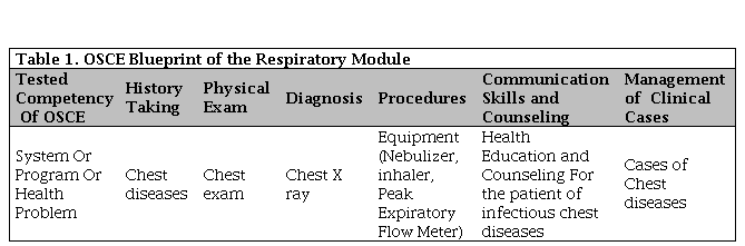 Secondly, responsible teamwork should design a blueprint of OSCE which should consist of two axes; the first axis is the tested competencies according to the learning objectives of the educational course or module while the second axis represents a system or problem that is related to these competencies. Thirdly, the blueprint should translate into definite skills, behaviors, and attitudes that will be assessed by the examiners based on the learning objectives through clinical competence assessment in history taking, physical examination, radiographic and laboratory data interpretation, technical skills, attitudinal behaviors, and counseling skills [10]. An illustrated example is shown in Table 1.