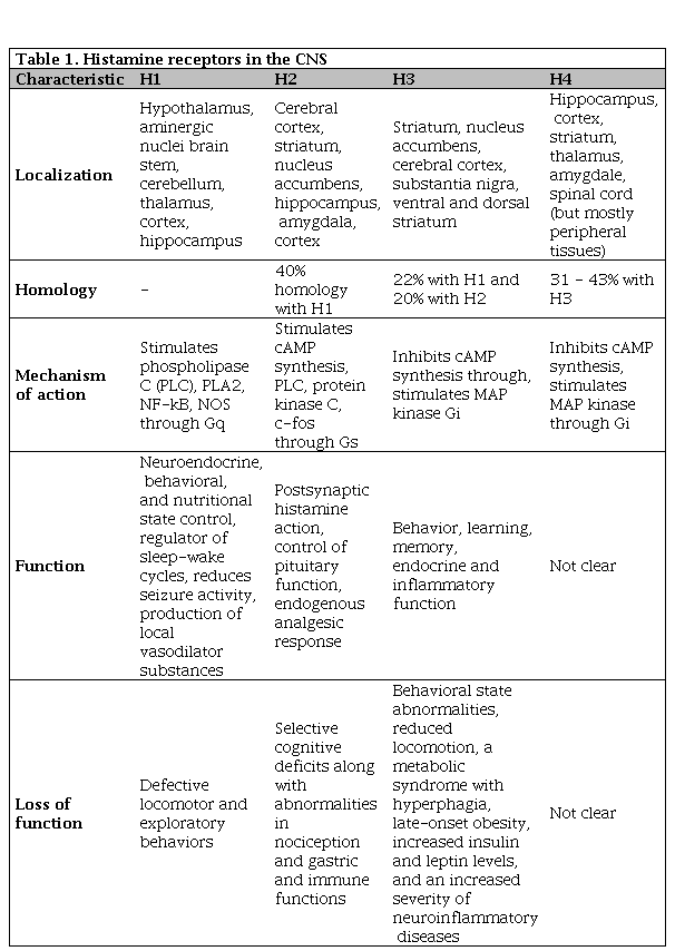 Until now, four types of histamine receptors were identified: H1, H2, H3, H4 receptors, named in the order of discovery [9, 10, 12]. Table 1 shows key points on histamine receptors in the CNS.