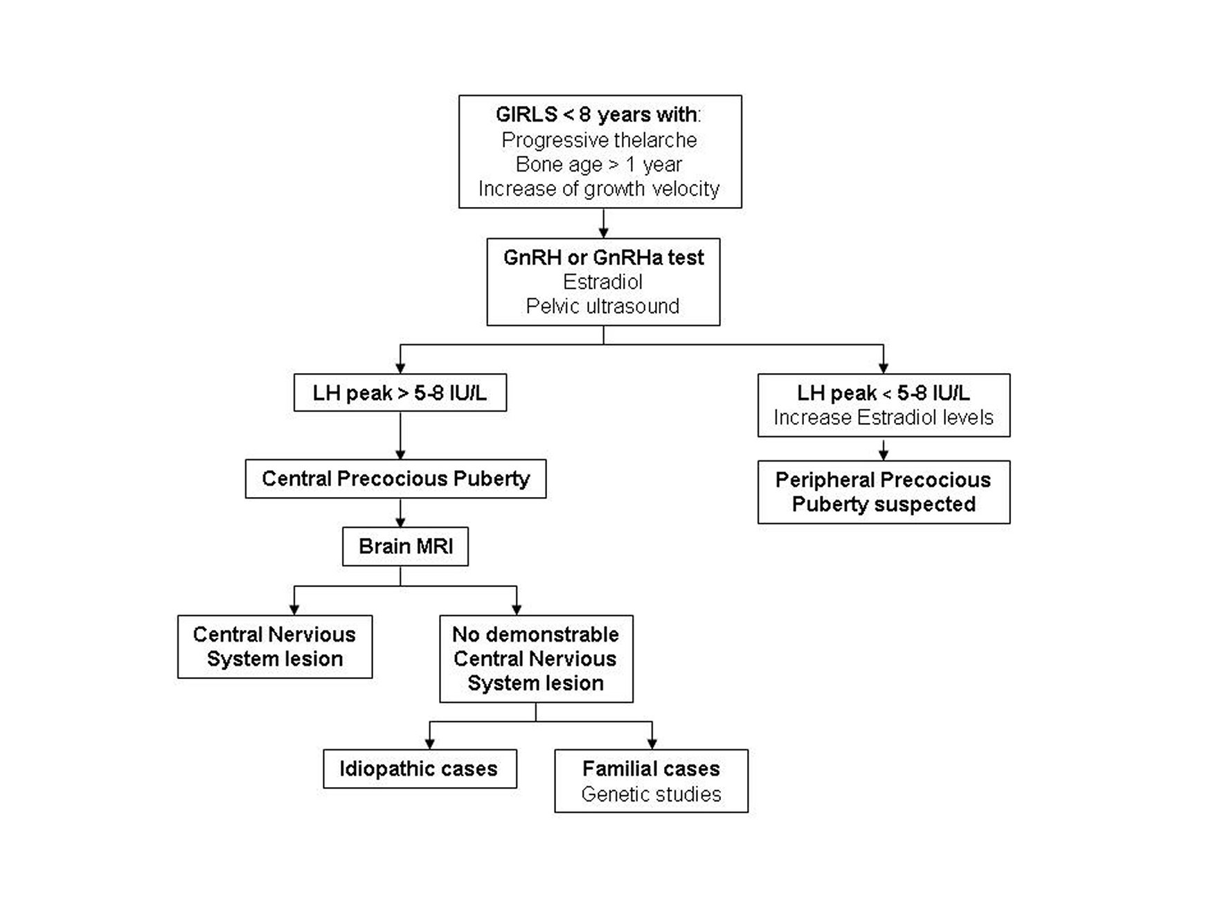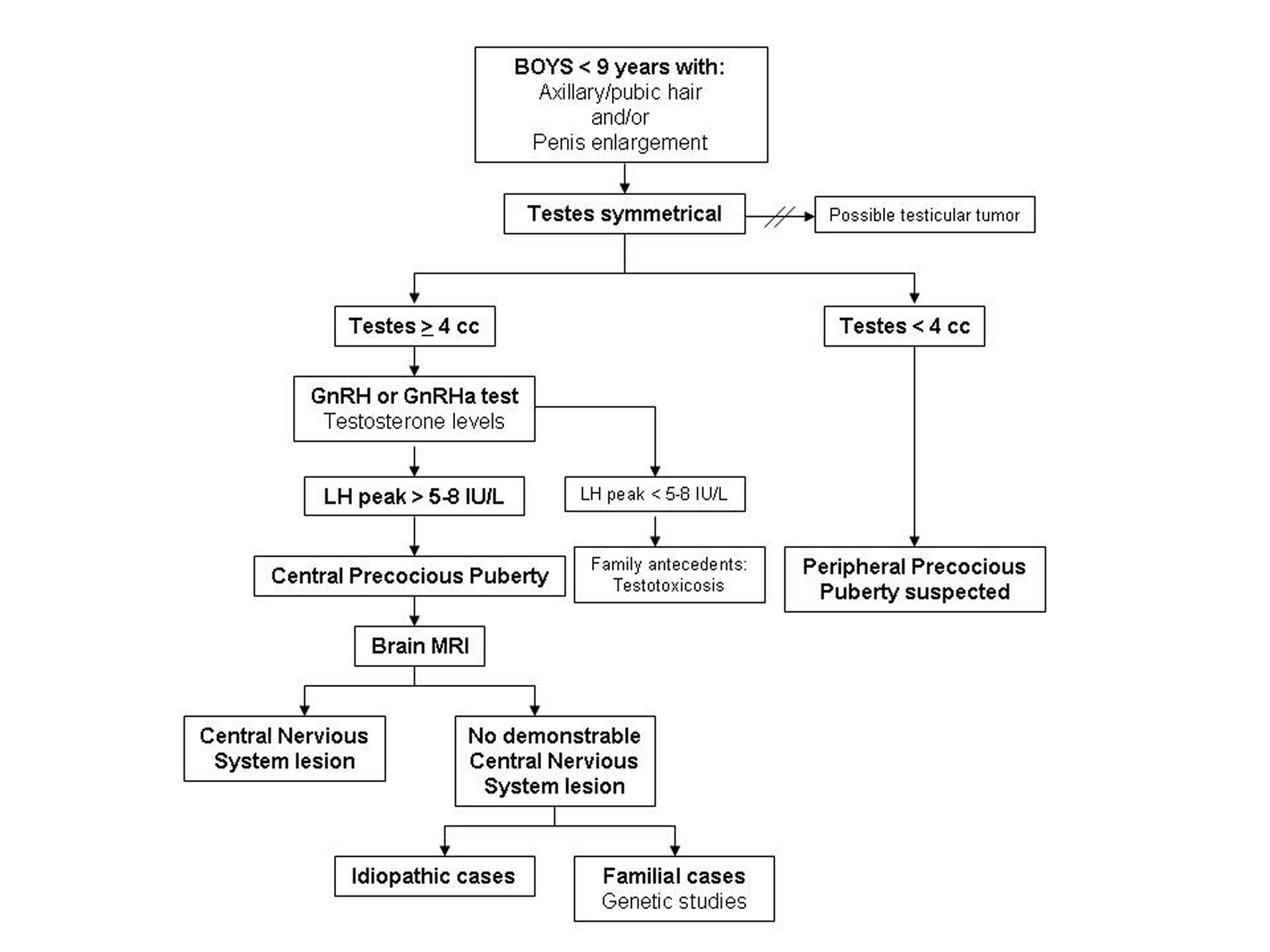 For the diagnosis of CPP, hormone studies are needed in addition to the clinical data regarding signs of pubertal onset. Analysis of LH peaks after GnRH testing is the gold standard in the biochemical diagnosis. Imaging studies, such as bone age, pelvic ultrasound and brain magnetic resonance imaging (MRI), are also very useful. Furthermore, genetic testing must be incorporated in familial cases [21, 24]. See the diagnostic algorithm for CPP in girls (Figure 1) and boys (Figure 2).