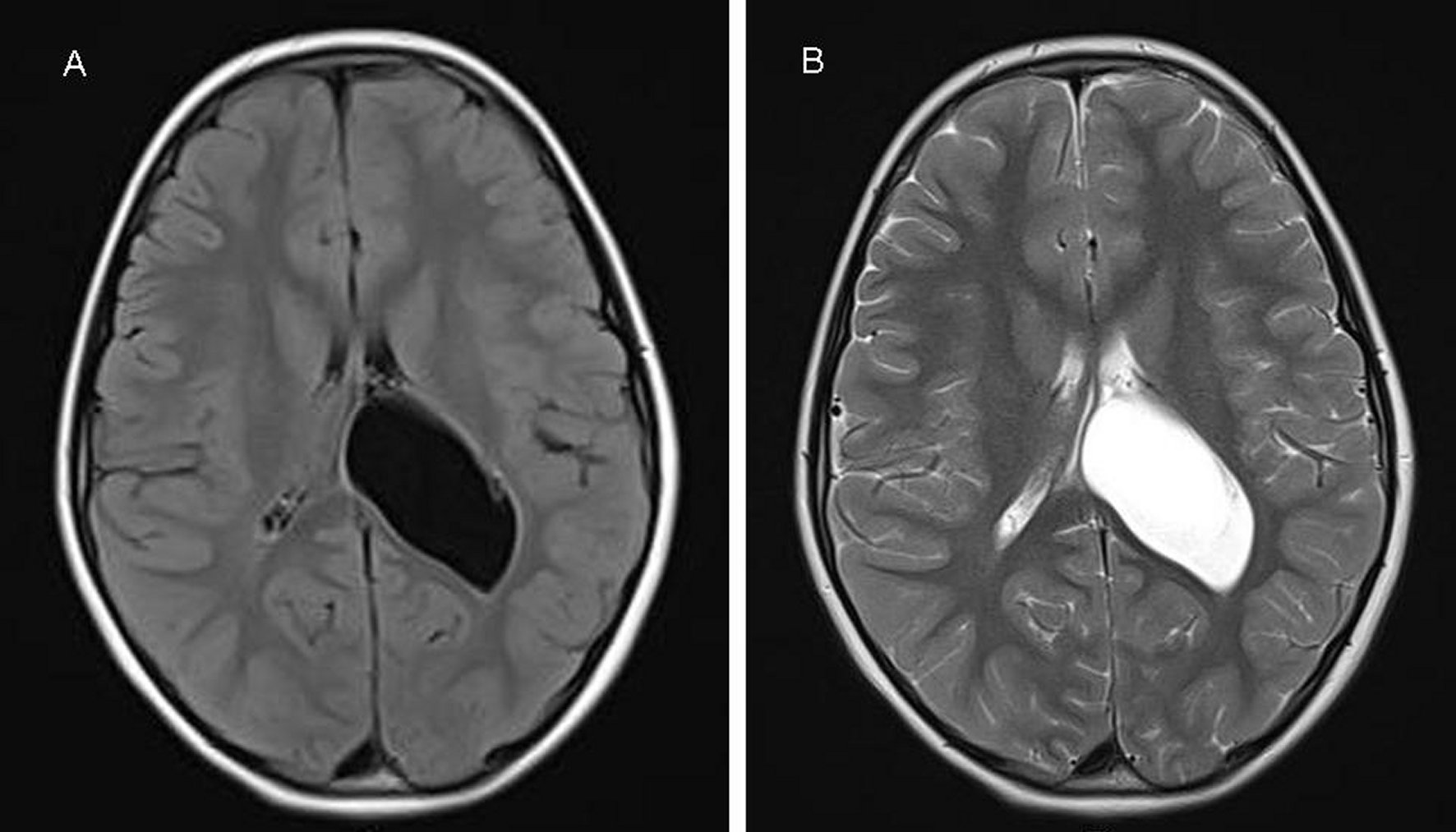A) Axial FLAIR image: the intraventricular cyst shows the typical water-like loss of signal, confirming its cerebrospinal fluid content. B) Axial T2-weighted image: a thin-walled hyperintense cerebrospinal fluid-like cyst inside the left ventricle is seen.