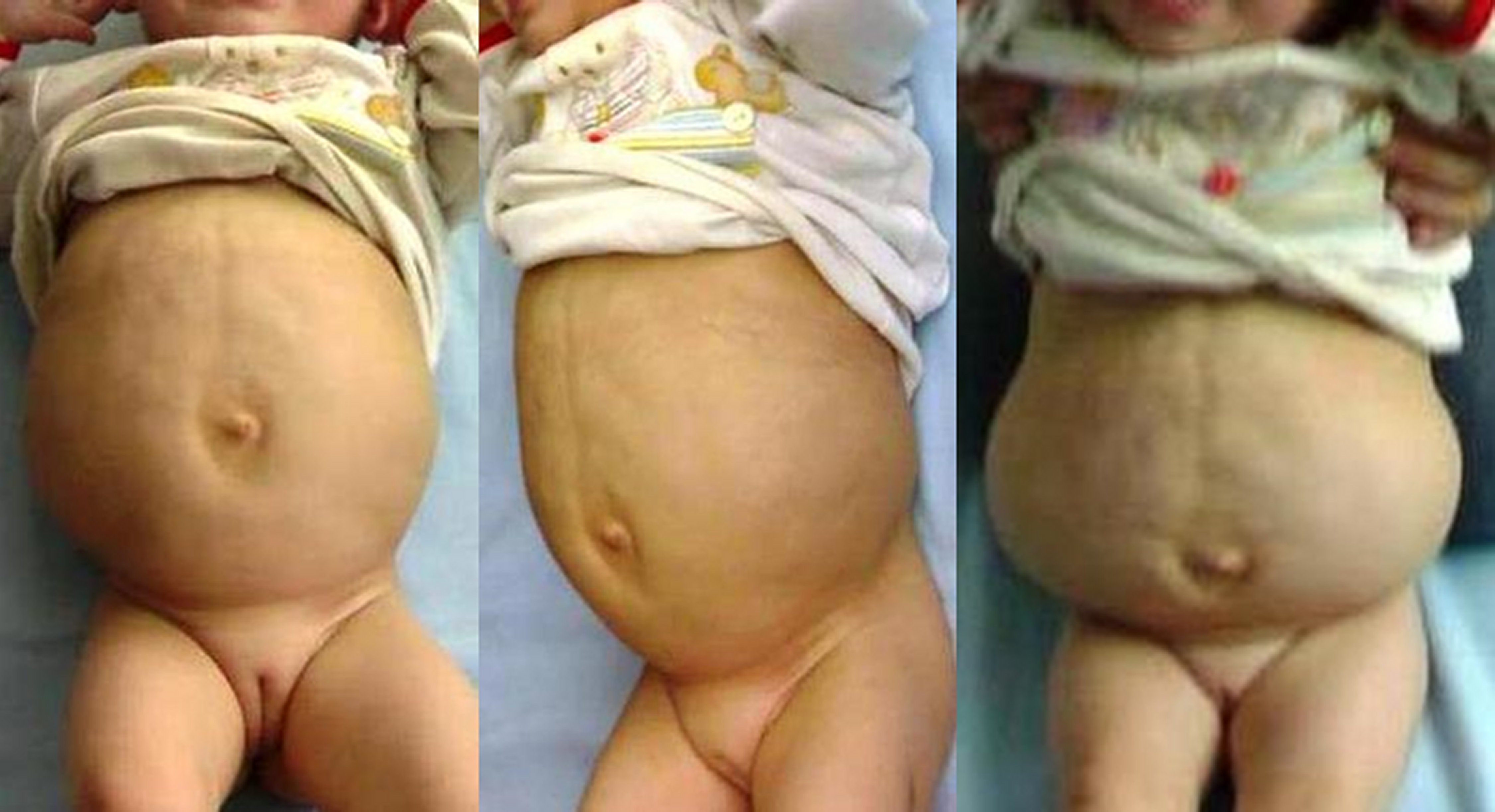 A 14-month-old girl presented with a history of gross motor development delay. She was born full-term with adequate weight for gestational age. She had pneumonia without sequelae at 11 months. Her physical development was normal (weight, length, and head circumference of 9,800 g, 79 cm, and 48 cm, respectively). The Denver Developmental Screening Test showed 8-month-old gross motor development milestones. The physical examination highlighted a loose and globular abdomen with a small umbilical hernia and diastasis recti; superficial veins and intestinal peristalsis were observed, especially in the right abdomen; there was no visceromegaly or palpable masses; when sitting up the girl, these signs were magnified showing a prune abdomen (Figure 1); the rest of the exam was normal. Upon clinical suspicion of prune belly syndrome (PBS), a pelvic, renal, and urinary tract ultrasound was performed, which was normal.