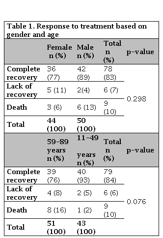 No significant difference was found between response to treatment and parameters of gender and age (Table 1).
