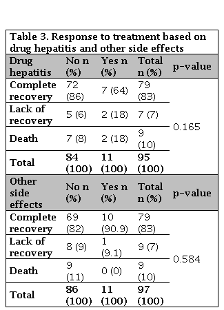 Finally, no significant difference was found between the frequency distribution of TB treatment response in terms of drug hepatitis complication and other drugs side effects (Table 3).