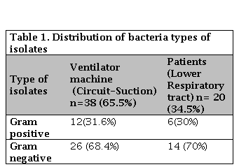 Out of the 100 specimens divided equally between ventilator circuits and lower respiratory tract patients were analyzed. Only 58 samples were culture positively. This number of isolated strains was detected among VC after 1 day of MV and patient’s LRT after 5 days from MV (38 (65.5%), 20 (34.5%)) respectively, whereas the remaining samples showed no microbial growth after the incubation period. The most common organism isolated was gram-negative from the ventilators (26, 68.4%) and mechanically ventilated patient's LRT were 14 (70%). Other isolates were Gram-positive from the patient’s LRT were 6 (30%) and from Ventilator circuits were 12 (31.6%) as shown in Table 1.