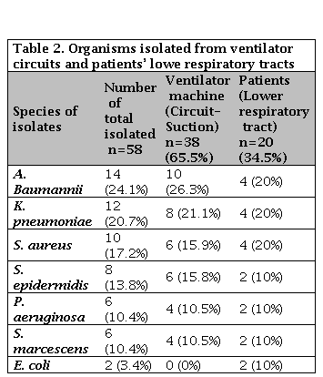 Results: A total of 58 samples were cultured positively, while 42 specimens showed negative bacterial growth. However, there was no substantial difference in comparing between the bacterial colonization of the ventilator system and the patient samples. Most isolated organisms were gram-negative bacteria which were found in the ventilator circuit with 26 (68.4%), and 14 (70%) in patient’s LRT. Gram-positive was detected in 12 (31.6%) and 6 (30%) of the ventilator circuit, and patient's LRT, respectively. The predominant bacterial type was Acinetobacter baumannii organism at the VC with 10 (26.3%) and LRT at 4 (20%) followed by Klebsiella pneumoniae (8 (21.1%) in VC and 4 (20%) in LRT). Moreover, A. baumannii showed a full resistance to amoxicillin and the first generation of cephalosporins, while the other bacterial types were resistant to the most antibiotics used in this research.