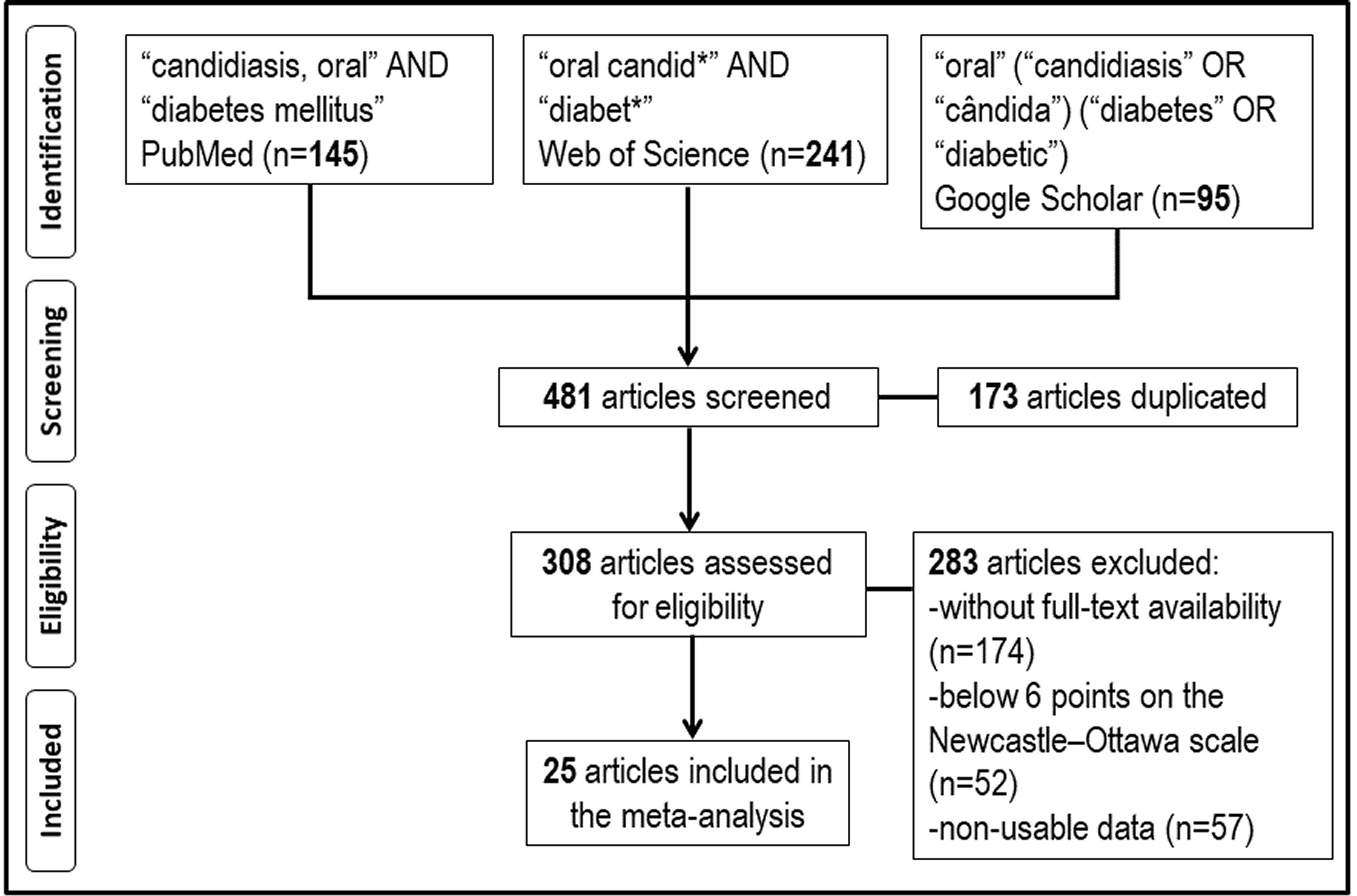 A search for studies on oral candidiasis and diabetes mellitus was conducted in the following databases: PubMed (MEDLINE, Cochrane Library), Web of Science (WoS) and Google Scholar. Search strategies were developed for each database with a combination of Medical Subjects Headings (MeSH) terms and free text terms. The search terms were: "candidiasis, oral" [MeSH Terms] AND "diabetes mellitus" [MeSH Terms]; "oral candid*" AND "diabet *"; allintitle: "oral" ("candidiasis" OR "candida") ("diabetes" OR "diabetic"). After this initial search, 481 articles (145 in PubMed, 241 in WoS and 95 in Google Scholar) were found between 1967 and 2020; 173 of them duplicates, leaving 308 articles for elegibility. Two researchers (ARA and CPR) examined the titles and abstracts of the articles independently, and later, both selected the papers that were included in this meta-analysis. The inclusion criterion was subjects of any age with a diagnosis of either type 1 or type 2 diabetes mellitus. The exclusion criteria were: a) articles without full-text availability (n = 174), b) articles with a score below 6 stars from a maximum of 9 on the Newcastle–Ottawa methodological quality assessment scale [4] (n = 52), and c) studies with non-usable data (n = 57). Finally, twenty-five studies were included in this meta-analysis (Figure 1).