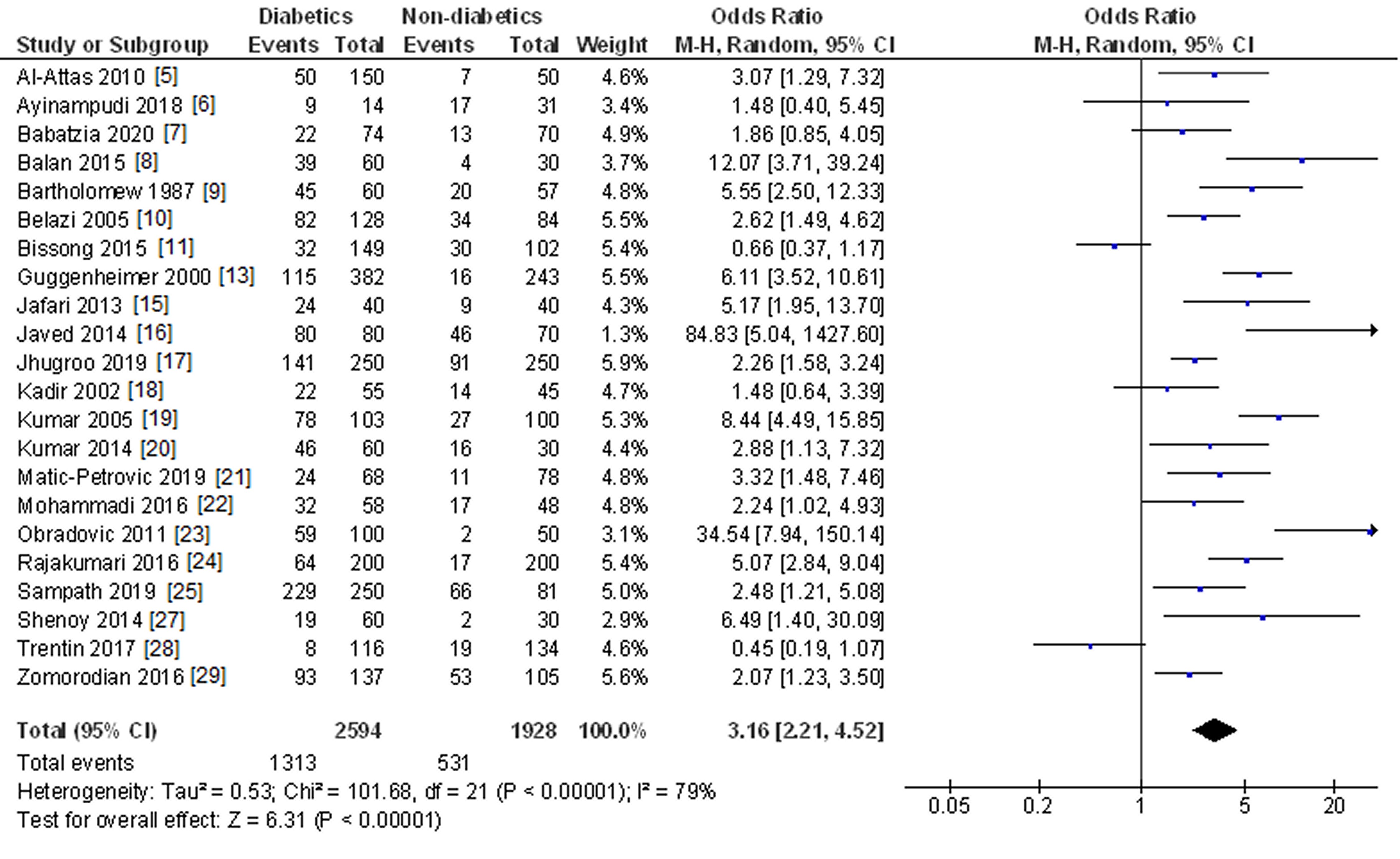 Methods: A search for studies on oral candidiasis and diabetes mellitus was carried out in the following databases: PubMed (MEDLINE, Cochrane Library), Web of Science (WoS) and Google Scholar. For dichotomous outcomes, the estimates of effects of an intervention were expressed as odds ratios (OR) using the Mantel-Haenszel (M-H) method with 95% confidence intervals.