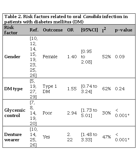 Results: 25 studies were included in this meta-analysis. Diabetes Mellitus patients tripled the probability of being infected by Candida species (OR:3.16, p<0.001). Likewise, Candida species infections were more likely in patients with poor glycemic control (OR:2.94, p<0.001) and with dentures (OR:2.22, p<0.001). In contrast, neither gender nor diabetes mellitus type of diabetes conditioned fungal infections (p>0.05). The most prevalent Candida species in both diabetics and controls were C. albicans and C. tropicalis. Diabetics had significantly fewer C. non-albicans species oral infections than non-diabetics (p=0.04).