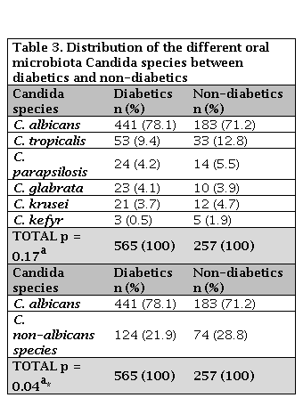 Table 3 displays the distribution of the different Candida species found in oral microbiota between diabetic and non-diabetic subjects. The most prevalent species was C. albicans in both diabetics (78.0%) and non-diabetics (71.2%), followed by C. tropicalis (9.4% in diabetics and 12.8% in non-diabetics) and, the least prevalent, C. kefyr (0.5 % in diabetics and 1.9% in non-diabetics). When the different Candida species are classified in two groups (C. albicans species and C. non-albicans species), non-albicans species were more frequent in non-diabetics (28.8%) than in diabetics (21.9%), with statistically significant differences (p = 0.04).