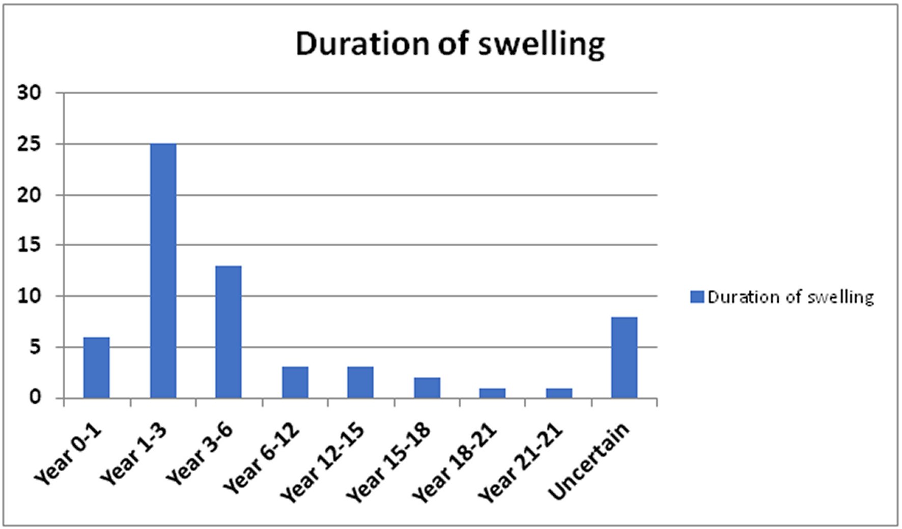 Sixty-two patients met the inclusion criteria and had an age range between 7 and 74 years, with a median interquartile range of 45 years. The age distribution of the patients is shown in Figure 1. The male-to-female ratio of the patients was 1:4. There were 354 cases of thyroid patients operated during the study period, and their clinical features include anterior neck swelling, dysphonia, dyspnoea, dysphagia, weight loss, pain, cervical masses, and bony swelling. The duration of neck swelling in patients who presented with thyroid cancer in the study is shown in Figure 2. The surgeries performed on the patients were total thyroidectomy, 48 (77.4%), completion-thyroidectomy, 14 (22.6%), near total thyroidectomy, eight (12.9%), and, subtotal thyroidectomy, four (6.5%). Thirty-eight (61.3%) of the patients were diagnosed incidentally after the reports of the histology of the thyroidectomy specimens were available. The histological types of carcinoma in the 62 patients are papillary, 34 (54.8%), follicular, 25 (40.3%), medullary, 2 (3.2%), and anaplastic, 1 (1.6%). The complications of management are respiratory obstruction, dysphonia, secondary haemorrhage, seroma, surgical site infection, wound dehiscence, hypertrophic scar, keloid, and death. Two of the patients who presented late with non-resectable tumours received palliative care, while two other patients died from the disease's progression (Figure 3). The limitations confronting effective care of patients identified in this series include late presentation, inadequate oncologic surgery, financial constraint, low utilization of radioiodine facility, and non-resectability of the recurrent or residual tumours.