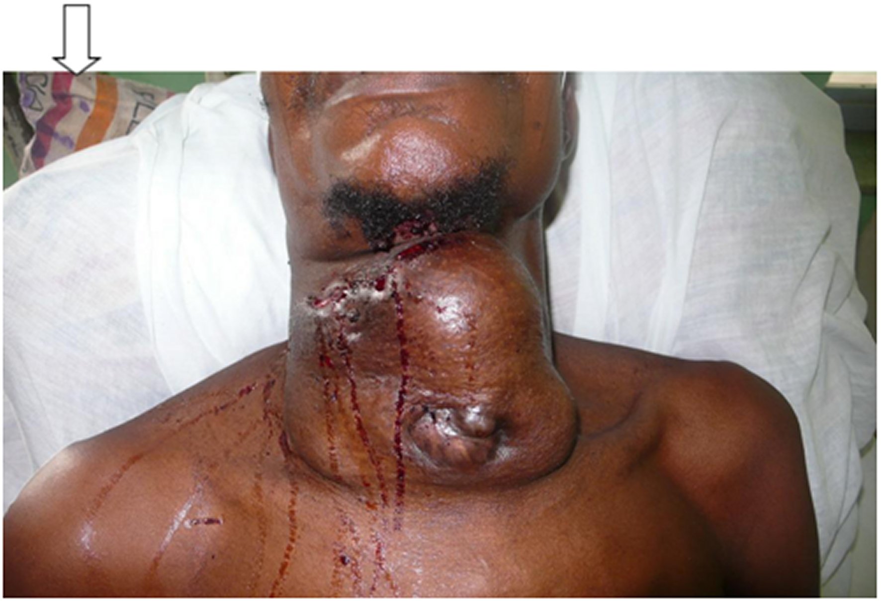 The clinical features in those patients whose diagnoses of thyroid cancer were apparent even before ancillary investigations were performed invariably demonstrated late presentation. These features include bone masses, ulcerating and bleeding thyroid masses as illustrated in Figure 3; others are cervical lymphadenopathy, and pathological fractures, etc. However, some clinical features like a goitre, dysphonia, dysphagia, and paresis of a vocal cord may not be specific for thyroid cancer because our patients usually present late with large goiters, with pressure on the contiguous structures [35]. The large goitres in the patients who presented late initially and the locally advanced recurrent or residual disease account for the complications like airway obstruction and seroma. The mortality of only two patients at the time of this review is attributed to the retrospective nature of the study with some of the patients lost to follow-up at our centre.