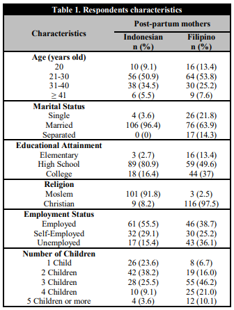 Results were extrapolated from questionnaires accomplished by the Indonesian mother-respondents (n=110) and Filipino mother-respondents (n=119) in this study. Data collection was carried out between August 2019 and March 2020.