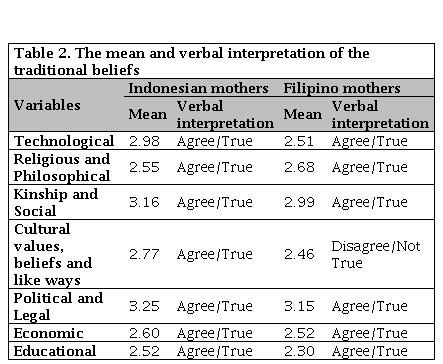 Methods: The study utilized a descriptive research design to Indonesian mother respondents (n=110) and Filipino mother-respondents (n=119) who were conveniently selected. Traditional beliefs focused on technological factors, religious and philosophical factors, kinship and social factors, cultural values, beliefs, lifestyles, political and legal factors, economic factors, and educational factors were evaluated.