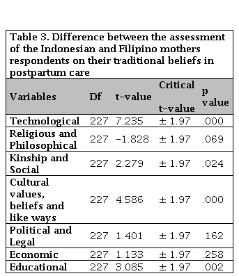 Table 3 supports the analysis in determining a significant difference in the assessment of Indonesian and Filipino mother respondents on their traditional beliefs in postpartum care. t-test was used to compare the seven dimensions of traditional beliefs in postpartum care at a 5% significance level.