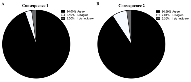 We next examined the potential impact of inappropriate laboratory testing by proposing two possible consequences, the draining of laboratory resources and the delayed completion of priority laboratory tests (Table 3, objective 1). More than 90% of participants agreed on the impact of inappropriate laboratory testing on clinical laboratory resources and test performance (Figure 1).