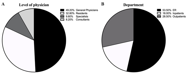 Besides, we were highly interested in determining the types of physicians and departments who contributed most to requests for inappropriate laboratory testing (Table 3, objective 4). Most participants admitted that unnecessary tests were almost all requested by general and resident physicians (Figure 4), while emergency rooms were the leading requestors of inappropriate laboratory testing as stated in Figure 4.