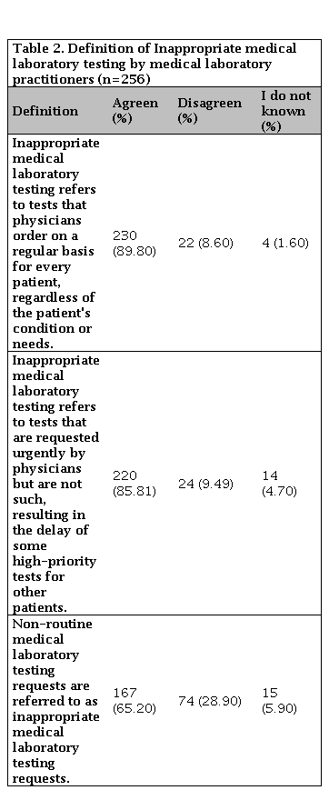 Methods: This cross-sectional study involved a total of 256 medical laboratory practitioners representing different qualifications and health care sectors, who answered several questions concerning their knowledge and attitudes toward inappropriate laboratory testing ordered by physicians.