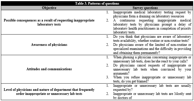 To examine the extent of participant satisfaction concerning laboratory testing requests, the survey was divided into two parts. The first examined participant knowledge concerning inappropriate laboratory testing and consisted of the definition of unnecessary laboratory testing and its impact on laboratory resources. The second constituted an assessment of the proper attitude among clinical laboratory members for preserving laboratory supplies.