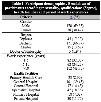 The survey used in this study was designed to determine factors that may influence laboratory resources and distributed to clinical laboratory professionals all over Saudi Arabia. The final study population constituted a total of 256 participants, who were of both genders and represented diverse qualifications, experiences, and types of hospitals. The proportion of male participants was greater than that of females, comprising over two-thirds the total (Male: n=178, 69.5%; Female: n=78, 30.5%; Table 1). The qualifications of the subjects were varied and ranged from a diploma to a Ph.D. (Table 1). The distribution of health facilities and job experience among participants is depicted in Table 1.