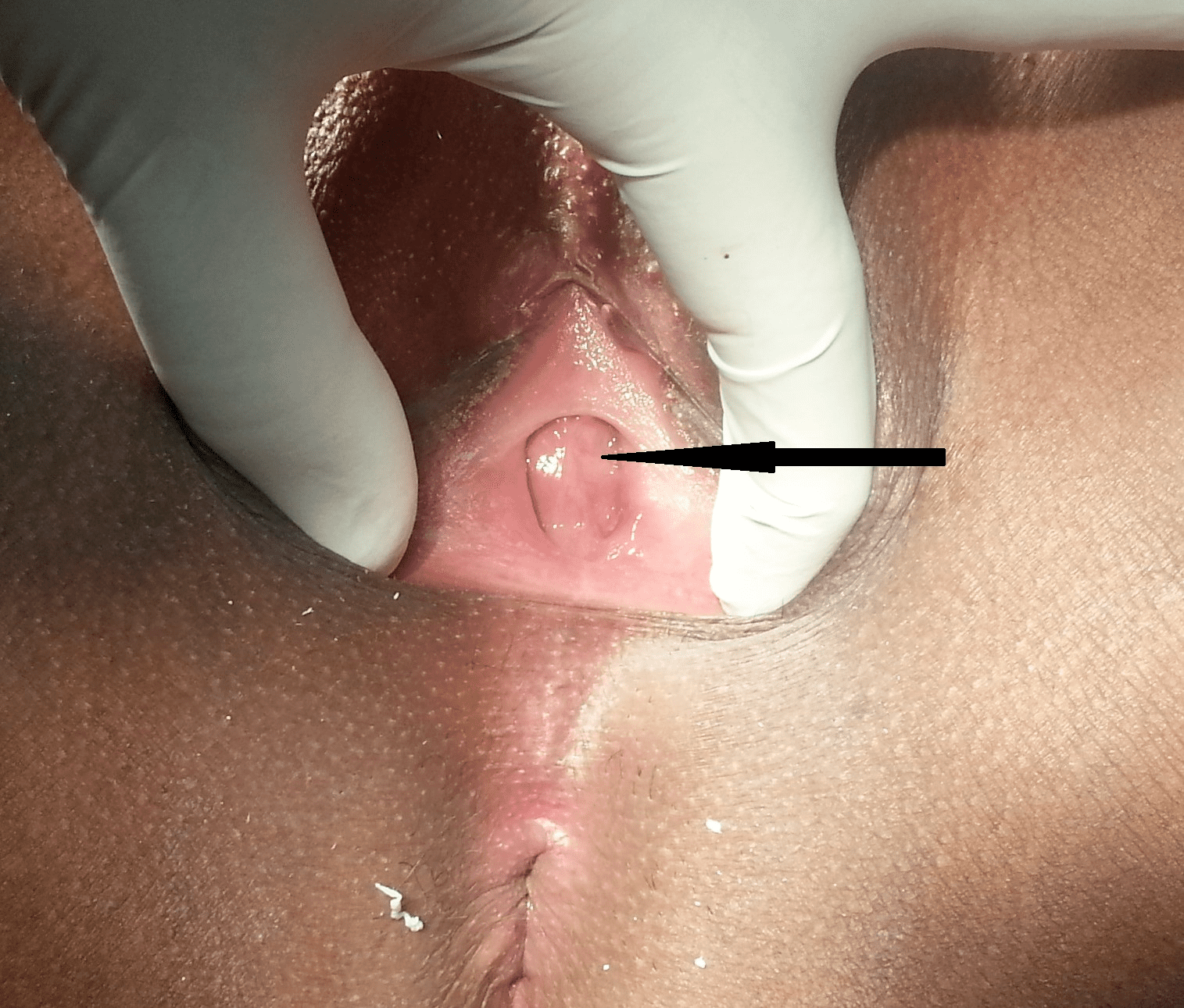 Nulligravida, 22 years of age lady presented to the outpatient clinic at Ain Shams University Maternity hospital for being infertile for 16 months with trouble in finishing sex (superficial dyspareunia). She had menarche at 12 years old; since that time, she had regular monthly cycle, on average changing three pads each day for 3 days with no history of circumcision. On general examination, she had typical female features with well-developed breasts (Tanner stage 5) and normal female hair distribution. Blood pressure was normal, and there were no palpable abdominal masses.
