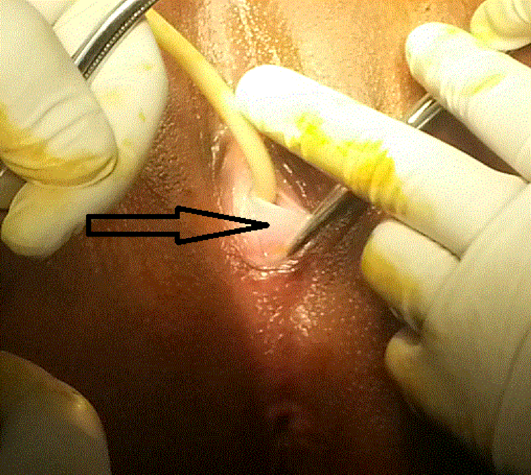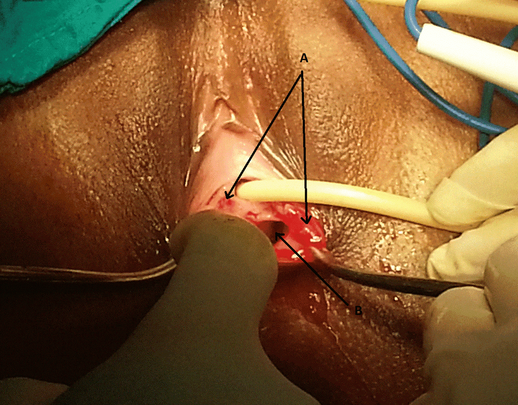 After taking Informed consent from the patient, repair was carried out with the patient in the standard lithotomy position under general anesthesia, and 18 Fr foley catheter introduced to the urinary bladder and inflated with 10 mL normal saline. Holding the sinus wall was done using artery forceps (Figure 2) with incision and later excision of 3 mm thickness septum using monopolar diathermy knife and the edges of the excised sinus was sutured using interrupted absorbable sutures in a circumferential manner with Vicryl 2–0 sutures. The vaginal opening and external urethral meatus was uncovered separate in the vestibular region (Figure 3). The vagina was patent, admitting two fingers freely to a depth of 10 cm.