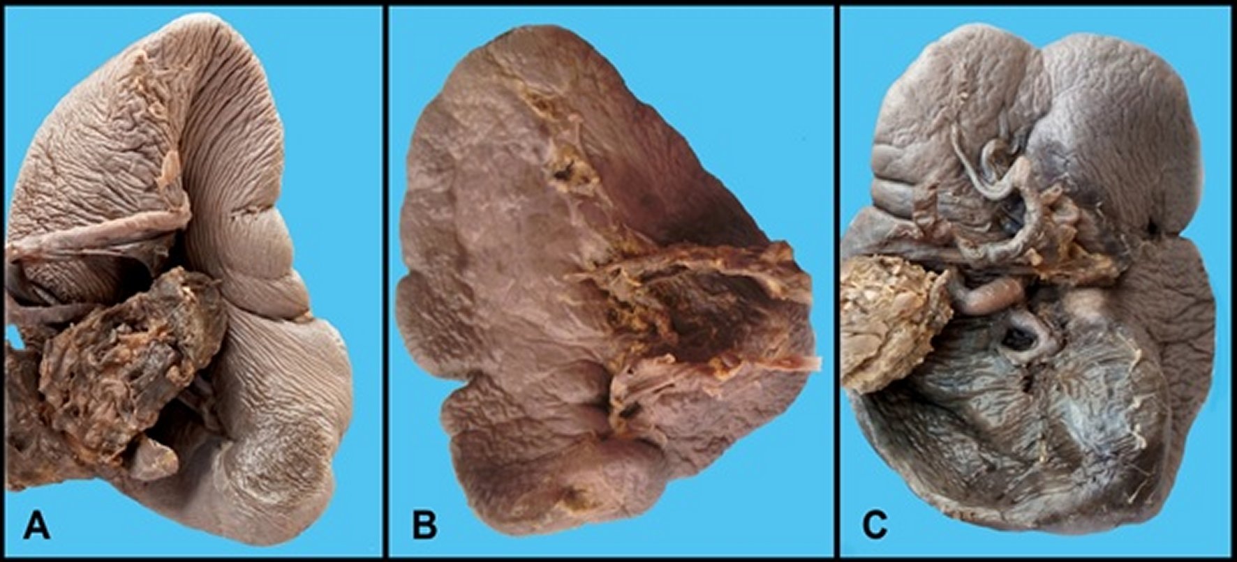 The human spleen was studied according to sex belonging to a group of 273 cadavers (154 men and 119 women), who did not have diseases of the spleen. The organs were fixed in a 10% formalin solution for seven days and then carefully dissected. The study was conducted according to the ethical laws of the institution and was approved by the ethical commission (19.08.2018 nr. 80). The shape of the spleen was analyzed based on splenic index (SI), which was defined as: width of the spleen divided by length of the spleen and multiplied by 100% (proposed by Inakov A.K., 1985). When the SI is less than 63% the spleen has elongated shape. If the SI is between 63% and 76% the shape is intermediate. When the SI is more than 76% the shape is round [11]. We also documented the shape of the spleen according to Michels classification (Figure 1) and other rare shapes (Figure 2) [5]. Statistical analysis was performed with the assistance of SPSS version 20 with the uses of modules of the program. The difference between means was assessed suing t-test. A p less than 0.05 was regarded as statistically significant.