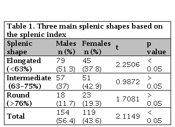 Based on the available data (Table 1), the most common shape of the spleen in men is the elongated one. It was encountered in 79 (51.3%) observations out of 154 cases. In women, the most common shape was the intermediate. It was encountered in 51 (42.9%) of the 119 cases. The elongated shape was more common in males than in females (Table 1, p<0.05). There was no difference for intermediate and round shape between groups (Table 1, p>0.05).