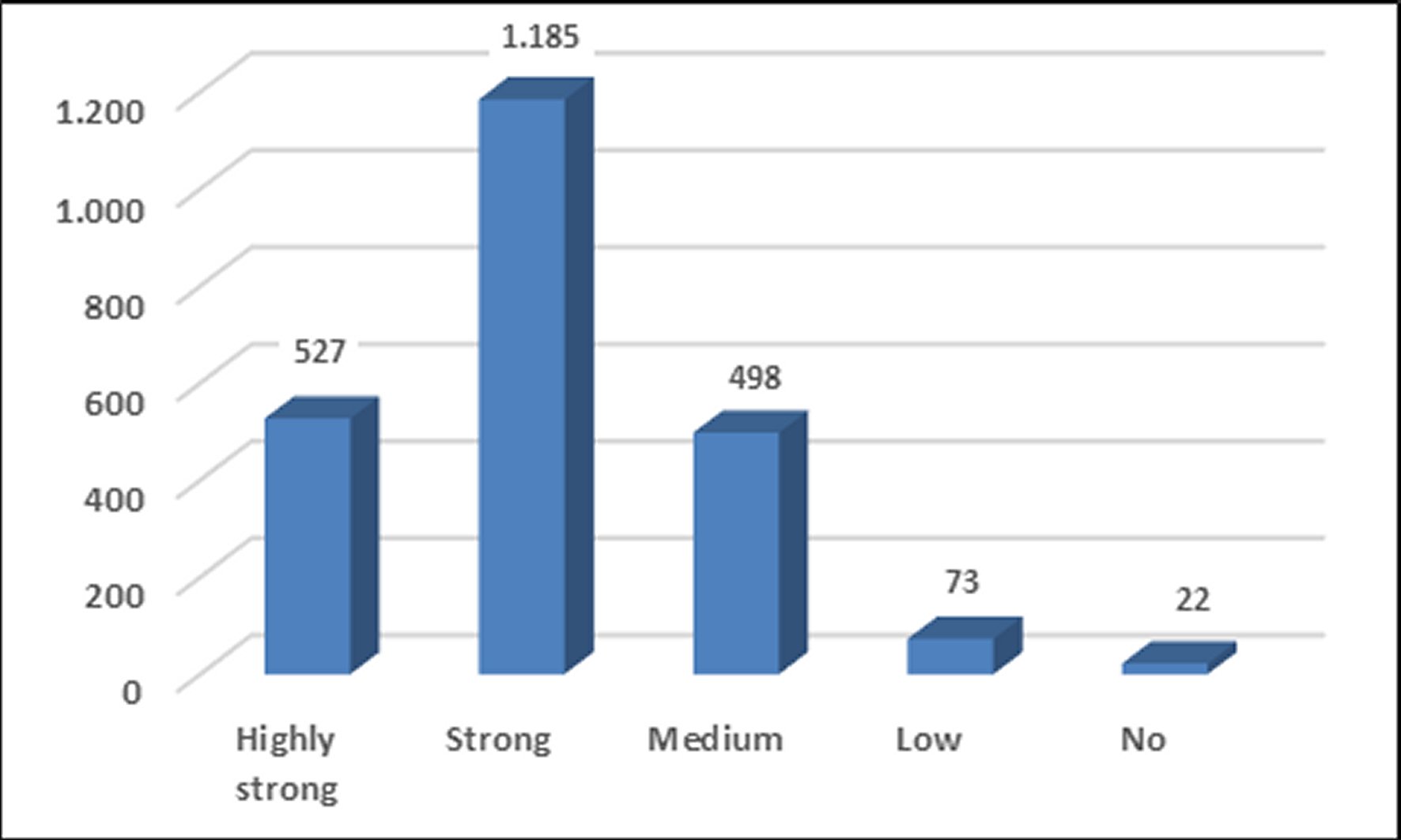 The level of awareness and understanding of the new coronavirus was given in Figure 1. The highest proportion was strong (n = 1185, 51.4%) followed by highly strong (n = 527, 22.9%). The proportions of medium, low and no awareness of the disease were (n = 498, 21.6%), (n = 73, 3.2%) and (n = 22, 0.9%), respectively.