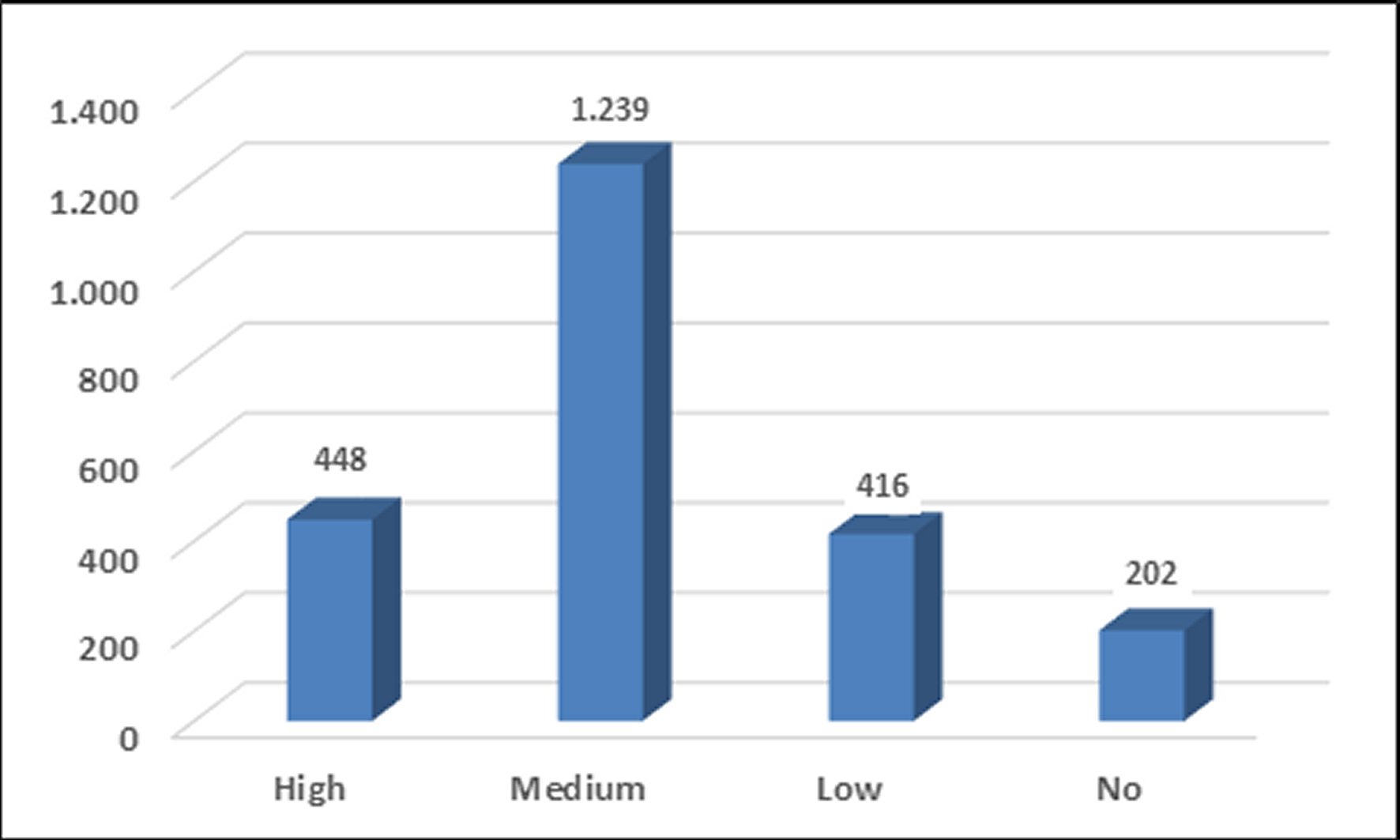 In Figure 2, the fear from infection responses were high (n = 448, 19.4%), medium (n = 1,239, 53.8%), low (n = 416, 18.0%) and no fear (n = 202, 8.8%). The low and no fear options were considered as positive results (26.9%) while high and medium reflects negative results (73.2%).