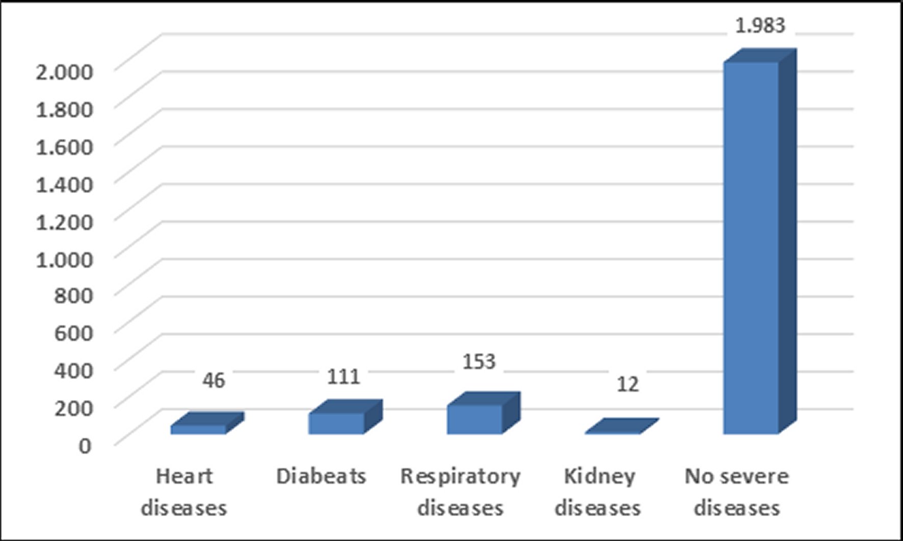 The possibility of chronic diseases presence among participants and the development of any respiratory symptoms since the onset of the disease are presented in Figures 3 and 4. Figure 3 shows the response for respiratory diseases (n = 153, 6.6%), heart disease (n = 46, 2.1%), diabetes (n = 111, 4.8%) and kidney diseases (n = 12, 0.5%), while participants who are free of the mentioned chronic diseases were the majority (n = 1983, 86 %).