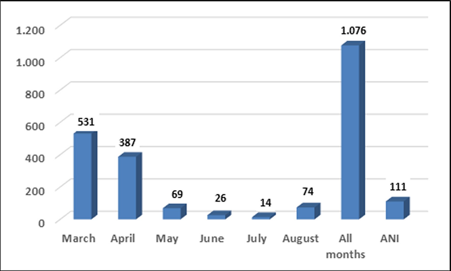 During the period from March to August 2020, when studying the participant’s compliance with the preventive authorities’ procedures, a slight compliance increase was found during the months of March and April, and then was decreased during the rest of months (Figure 5). In addition, a number of participants (n = 111, 4.8 %) are not interested at all in applying any precautionary measures, although a number of participants (n = 1,076, 46.8 %) has responded that they are committed in all months.