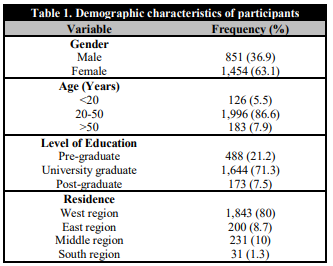 Only three participants were excluded from the study because of their age (<18 years). Then, 2,305 subjects were involved in this study. The demographic details of the participants involved in this study are shown in Table 1. The response rates of the participants, from the four main regions of Libya, are 80% from the West region, 8.7% from the East region, 10% from the Middle region and 1.3% from the South region. The majority of the participants are females (63.1%), with the majority of the 20-50 years' age group (86.6%). Level of education among the responses are mostly university graduates (71.3%).