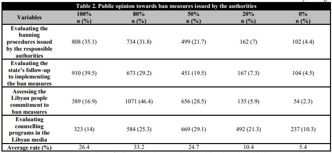 The opinion of Libyans towards the ban measures that have been taken by the authorities in the country is summarized in Table 2. The highest proportion went to disagree (20%) which is ranged from 25.3% (evaluating counselling programs in the Libyan media) to 46.4% (assessing the Libyan people commitment to ban measures) and the average rate value was 33.2%. It was followed by strongly disagree (0%) that range from 14 % (evaluating counselling programs in the Libyan media) to 39.5% (evaluating the state’s follow-up to implementing the ban measures) with an average rate value of 26.4%. This opinion expresses Libyans' dissatisfaction with the measures taken by the responsible authorities, whether at the level of decisions or their follow-up on the ground.