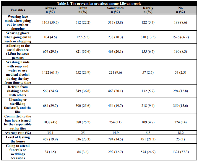 Materials and methods: A cross-sectional online study was conducted among Libyans between Sep. 15th, and Oct. 29th, 2020 using a developed-design questionnaire consisting of 23 questions assessing the aim of the study. 2305, who agreed to participate, was involved in the present study.